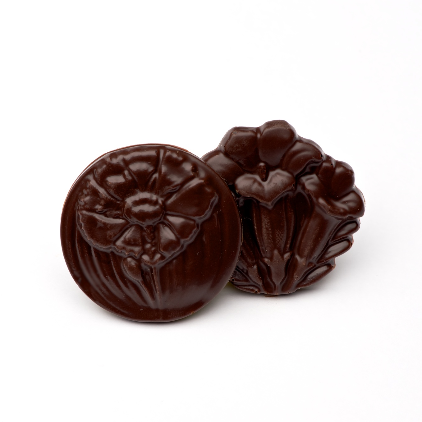 Assortiment van volle chocolaatjes met motief van bloemen.