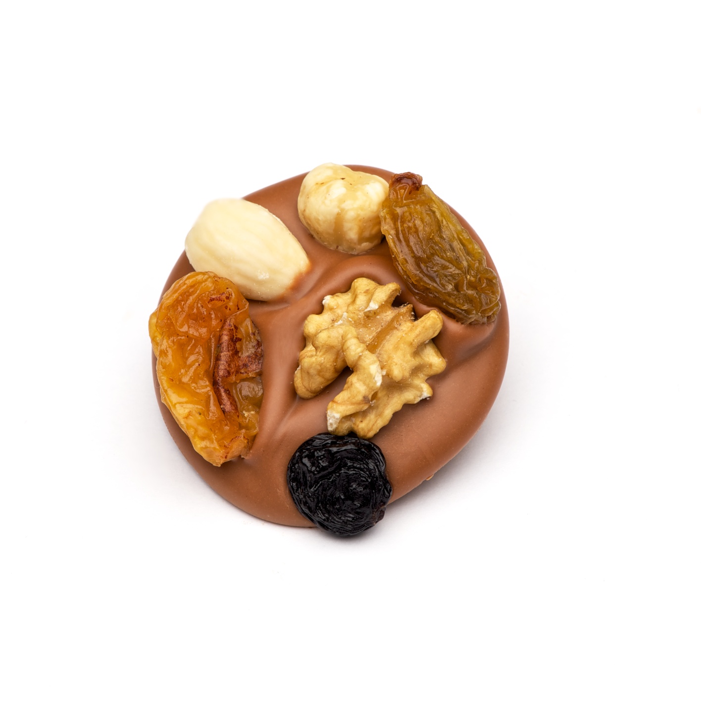 Fondant chocolade Amandelen, Hazelnoten, Rozijnen, Walnoten
