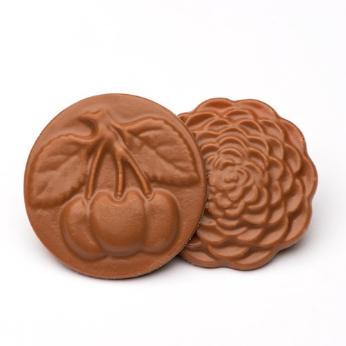 Assortiment van volle chocolaatjes met motief van bloemen.