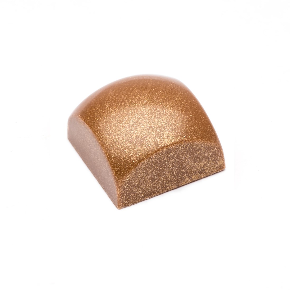 Vierkant en toch rond, dit mooie vormpje werd gedecoreerd met goudpoeder en gevuld met een gezouten caramel.