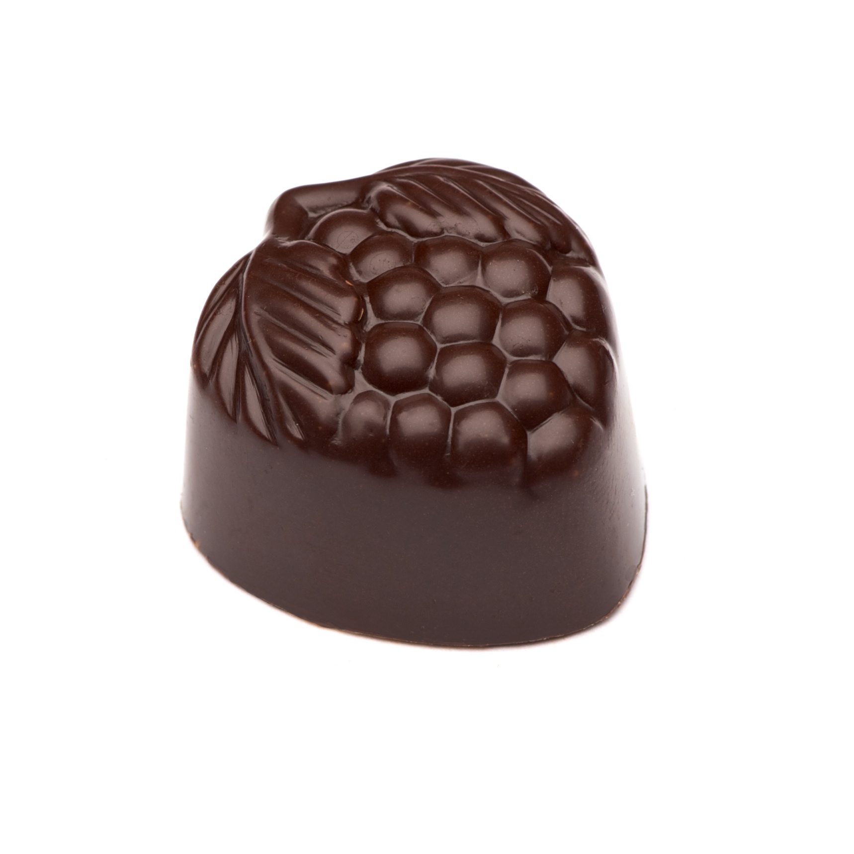 Een ganache van bosvruchten en amarenakersen, in een fondantchocoladen praline.