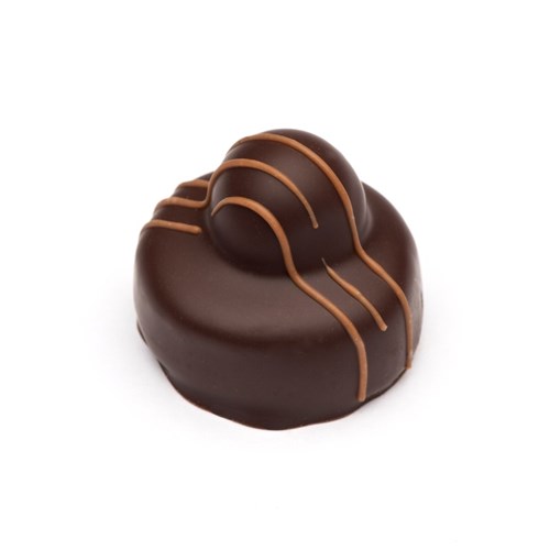 Marsepein, geparfumeerd met kersen en Kirsch, een hele amarenakers erbovenop en geënrobeerd met fondantchocolade. Decoratie met melkchocolade.
