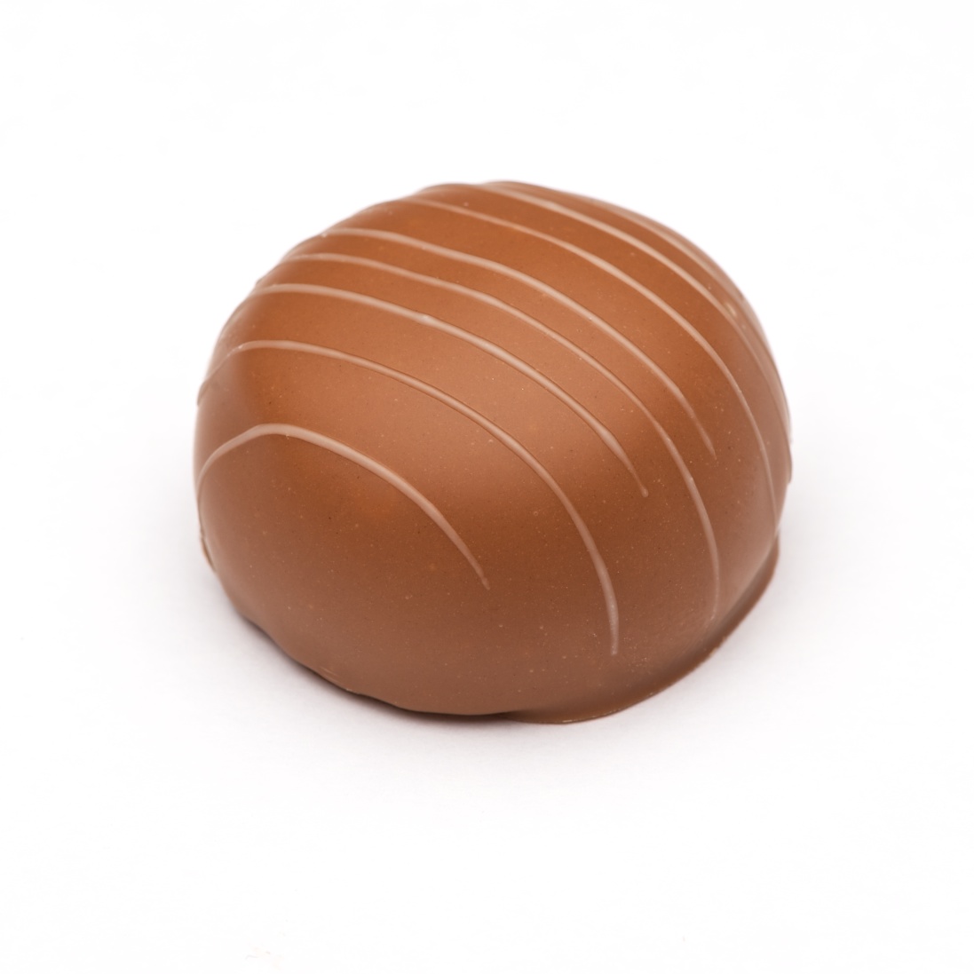 Een pittige botercrème koffie op een dun marsepein schijfje. Overgoten met melkchocolade en gedecoreerd met witte chocolade.
