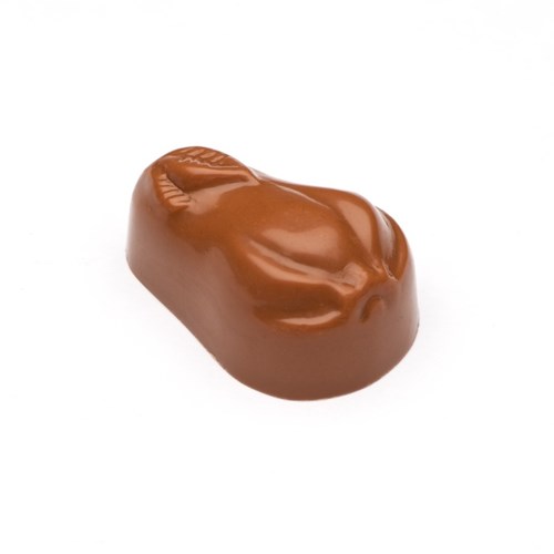 Een peertje in melkchocolade, gevuld met een Poire Williams botercrème.