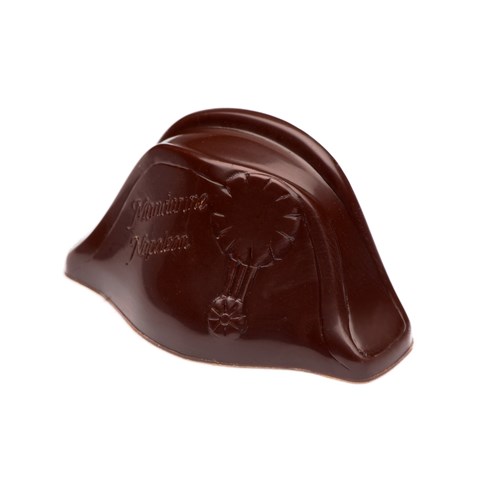 De hoed en de likeur verenigd in een fondantchocoladen praline. Gevuld met een ganache van Mandarine Napoléon.